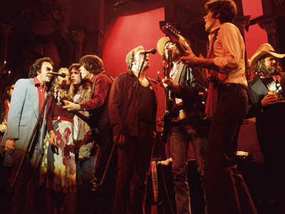 The Last Waltz. Fr. v: Neil Diamond, Joni Mitchell, Neil Young, Rick Danko, Van Morrison, Bob Dylan, Robbie Robertson och Ronnie Hawkins.